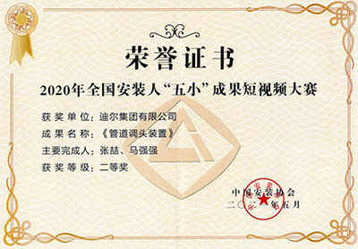 2021年5月,全国安装人“五小”成果短视频大赛总决赛在上海东方电视台演播厅举行。大赛紧扣“质量提升、科技创新、绿色建造”的主题,以短视频形式来呈现,所有参赛作品围绕安装行业实际生产管理、施工技术、工艺设备等进行的“小发明,小创造,小革新,小设计,小建议”的“五小成果”发掘和展示。公司发明成果短视频《管道掉头装置》荣获2020年全国安装人“五小”成果短视频大赛二等奖。