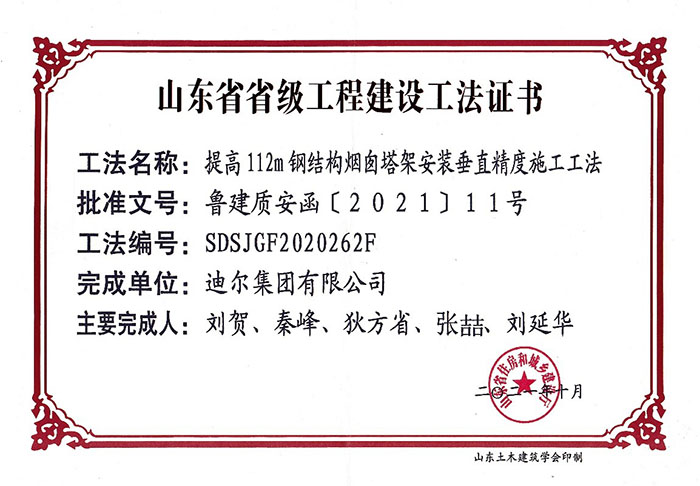 公司荣获省级施工工法“提高112m钢结构烟囱塔架安装垂直精度施工法”