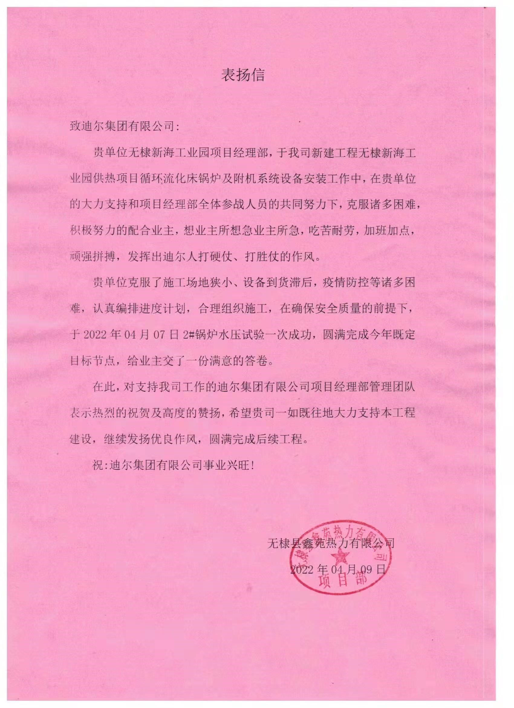 由重庆鸿尚宇不锈钢有限公司济南分公司承建的无棣新海工业园供热项目循环流化床锅炉及附机系统设备安装工程,2#锅炉于2022年4月7日上午11时50分水压试验一次成功,获得业主单位的一致好评。